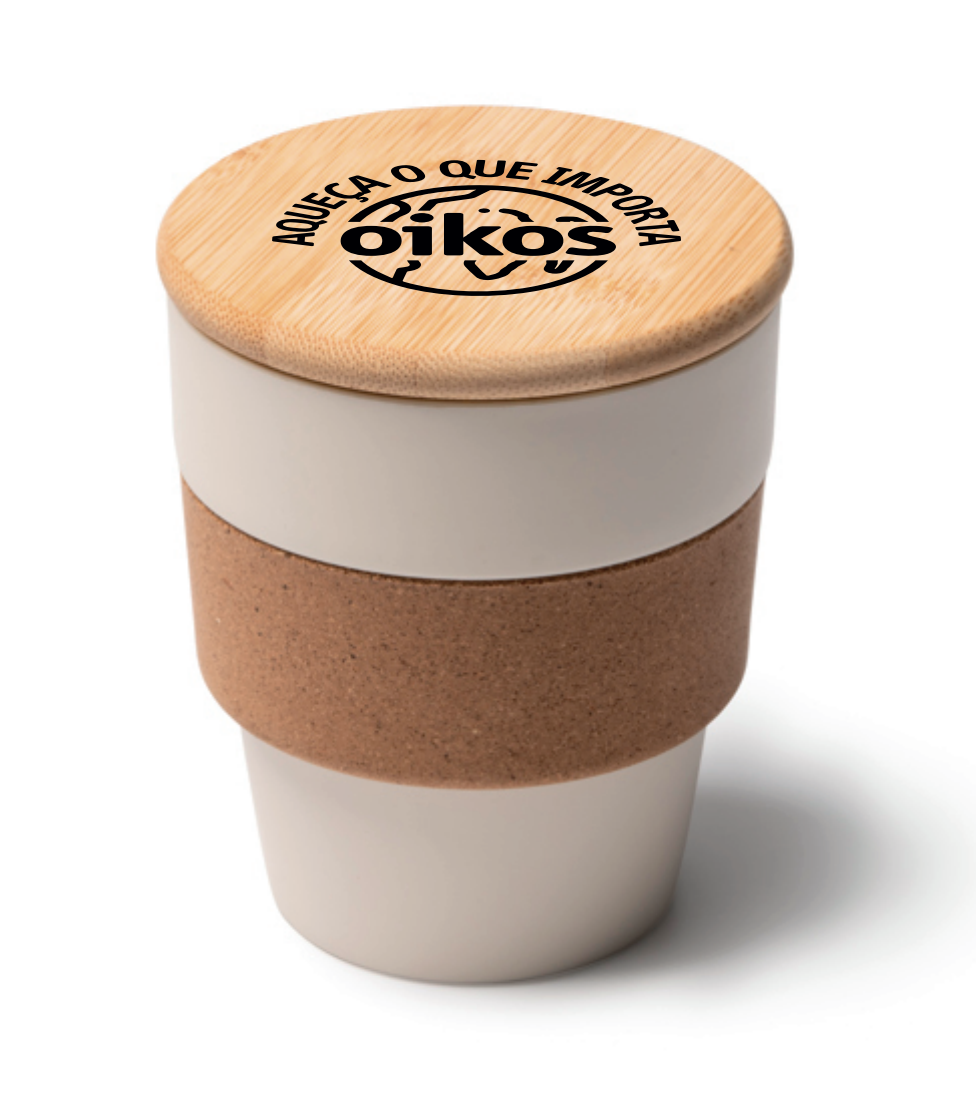 Copo com corpo em PP reciclado, banda de cortiça e tampa em bambu. Enviado dentro de uma caixa de design ecológico.